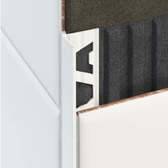 An Aluminium profile for protecting and finishing tiled corners and edges. Provides a decorative finish and protects adjacent tile edges. Features a perforated anchoring leg for securing in adhesive or mortar bond below the tiled surface. Chemically pre-treated and polyester powder coated.